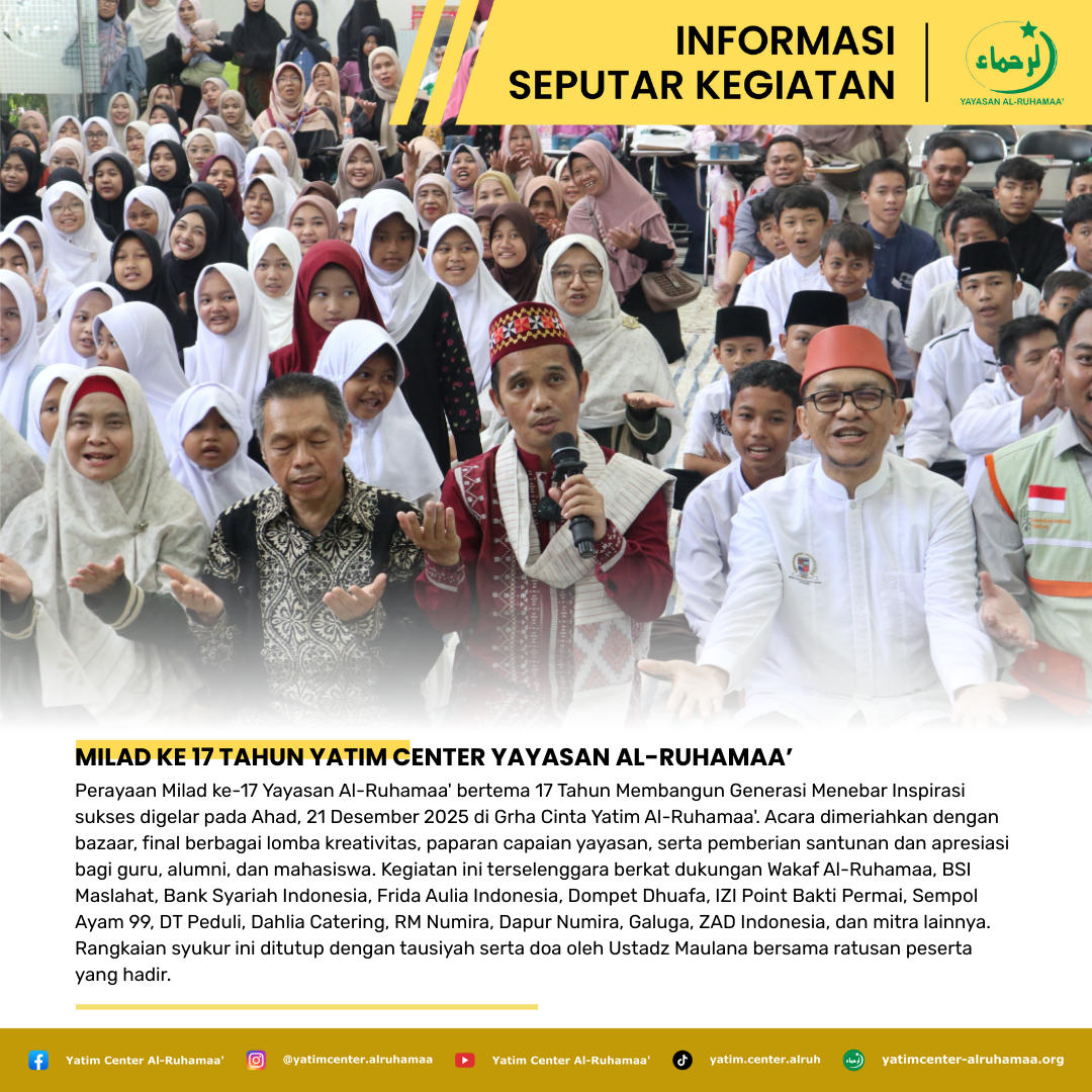 Masya Allah, Tabarakallah! Serunya momen perayaan Milad ke-17 Yayasan Al-Ruhamaa' yang dilaksanakan pada Ahad, 21 Desember 2025 di Grha Cinta Yatim Al-Ruhamaa' masih terasa sampai sekarang!