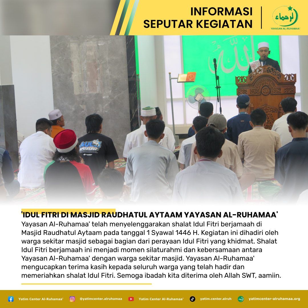 Yayasan Al-Ruhamaa' telah menyelenggarakan shalat Idul Fitri berjamaah di Masjid Raudhatul Aytaam pada tanggal 1 Syawal 1446 H. Kegiatan ini dihadiri oleh warga sekitar masjid sebagai bagian dari perayaan Idul Fitri yang khidmat.