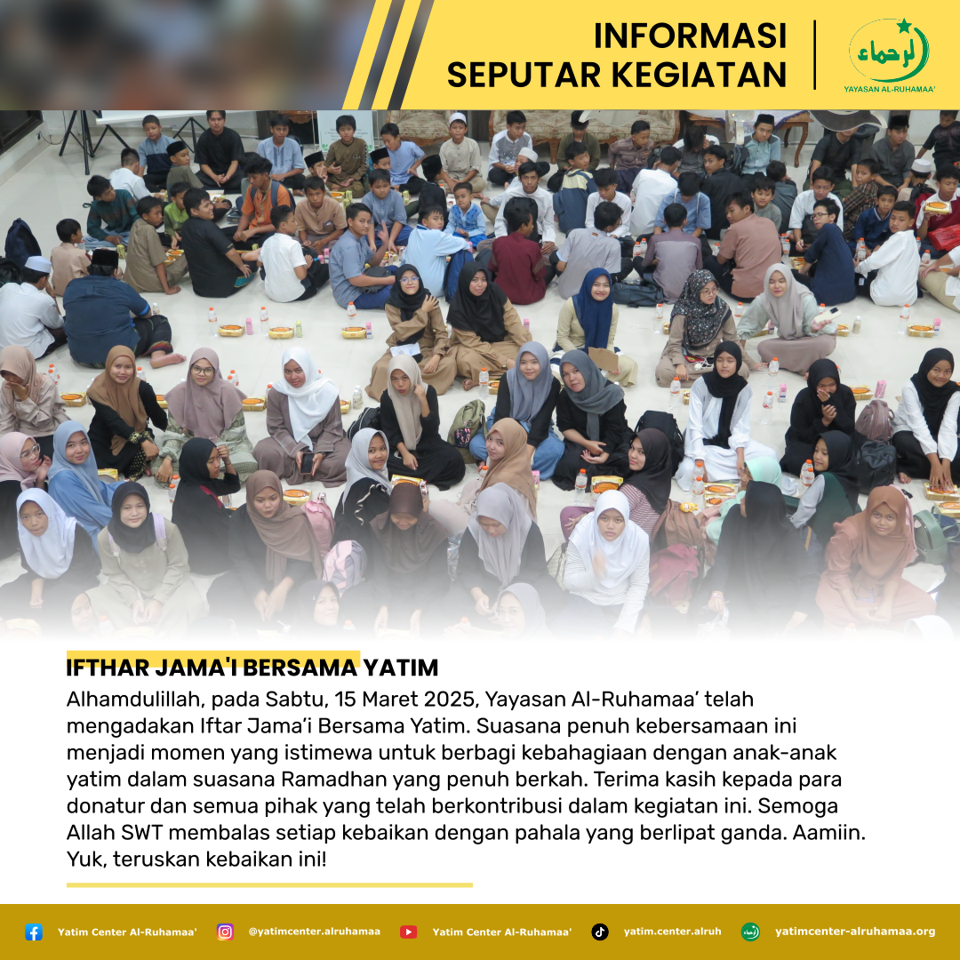 Alhamdulillah, pada Sabtu, 15 Maret 2025, Yayasan Al-Ruhamaa’ telah mengadakan Iftar Jama’i Bersama Yatim. Suasana penuh kebersamaan ini menjadi momen yang istimewa untuk berbagi kebahagiaan dengan anak-anak yatim dalam suasana Ramadhan yang penuh berkah.