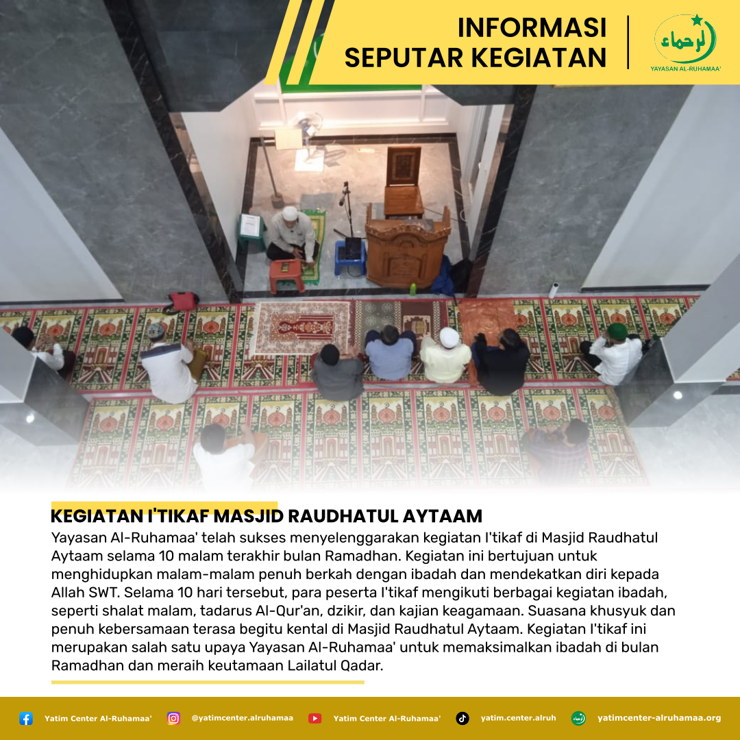 Yayasan Al-Ruhamaa' telah sukses menyelenggarakan kegiatan I'tikaf di Masjid Raudhatul Aytaam selama 10 malam terakhir bulan Ramadhan. Kegiatan ini bertujuan untuk menghidupkan malam-malam penuh berkah dengan ibadah dan mendekatkan diri kepada Allah SWT.