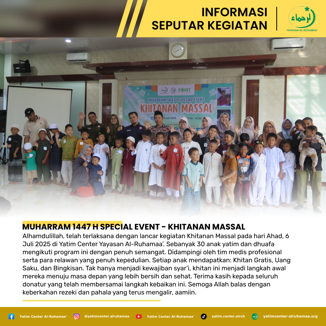 Alhamdulillah, telah terlaksana dengan lancar kegiatan Khitanan Massal pada hari Ahad, 6 Juli 2025 di Yatim Center Yayasan Al-Ruhamaa’.