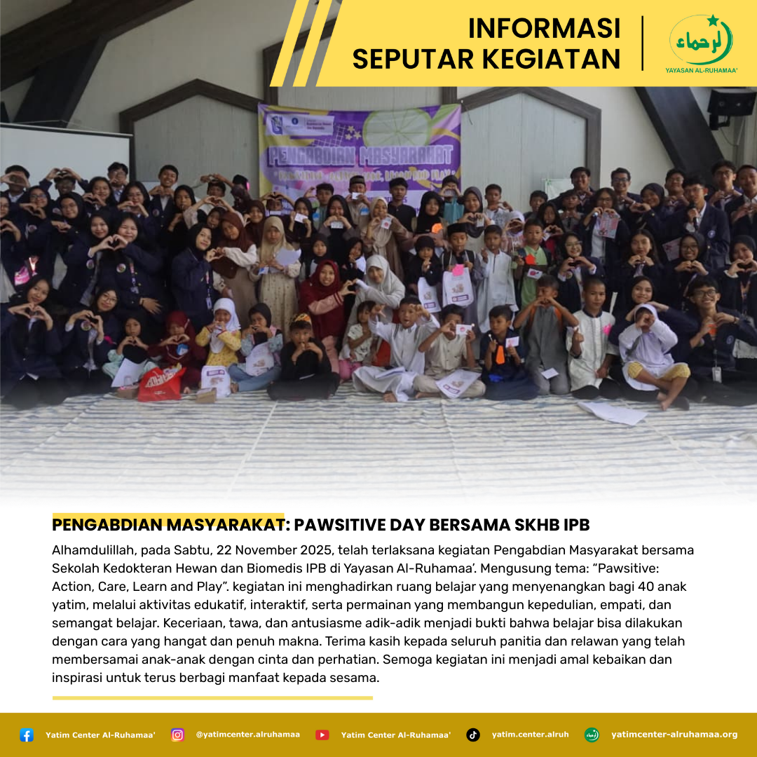 Alhamdulillah, pada Sabtu, 22 November 2025, telah terlaksana kegiatan Pengabdian Masyarakat bersama Sekolah Kedokteran Hewan dan Biomedis IPB di Yayasan Al-Ruhamaa’.
