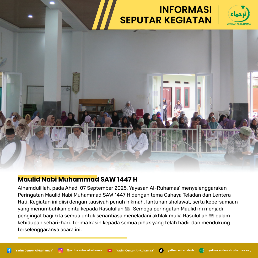 Alhamdulillah, pada Ahad, 07 September 2025, Yayasan Al-Ruhamaa’ menyelenggarakan Peringatan Maulid Nabi Muhammad SAW 1447 H dengan tema Cahaya Teladan dan Lentera Hati. Kegiatan ini diisi dengan tausiyah penuh hikmah, lantunan sholawat, serta kebersamaan yang menumbuhkan cinta kepada Rasulullah ﷺ. Semoga peringatan Maulid ini menjadi pengingat bagi kita semua untuk senantiasa meneladani akhlak mulia Rasulullah ﷺ dalam kehidupan sehari-hari. Terima kasih kepada semua pihak yang telah hadir dan mendukung terselenggaranya acara ini.