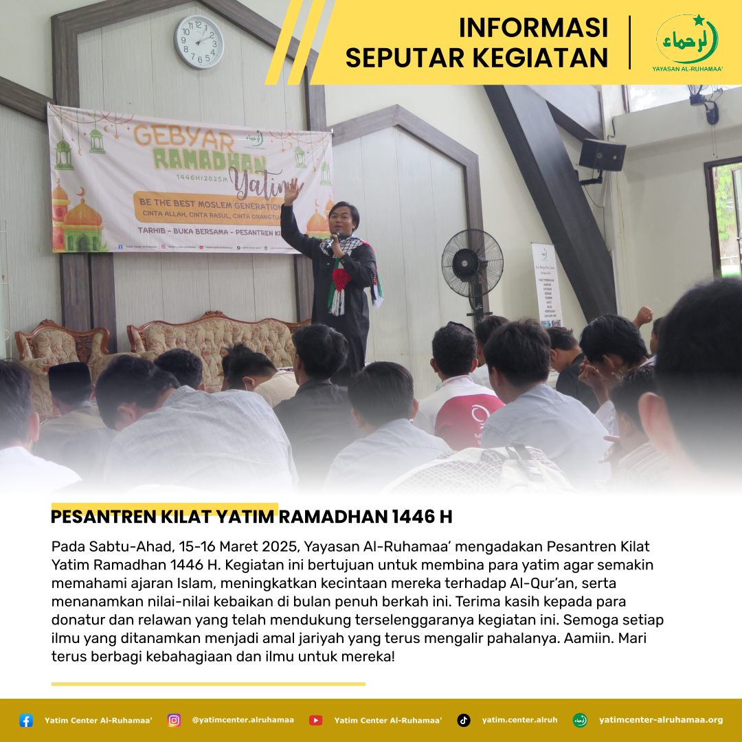 Pada Sabtu-Ahad, 15-16 Maret 2025, Yayasan Al-Ruhamaa’ mengadakan Pesantren Kilat Yatim Ramadhan 1446 H. Kegiatan ini bertujuan untuk membina para yatim agar semakin memahami ajaran Islam, meningkatkan kecintaan mereka terhadap Al-Qur’an, serta menanamkan nilai-nilai kebaikan di bulan penuh berkah ini.